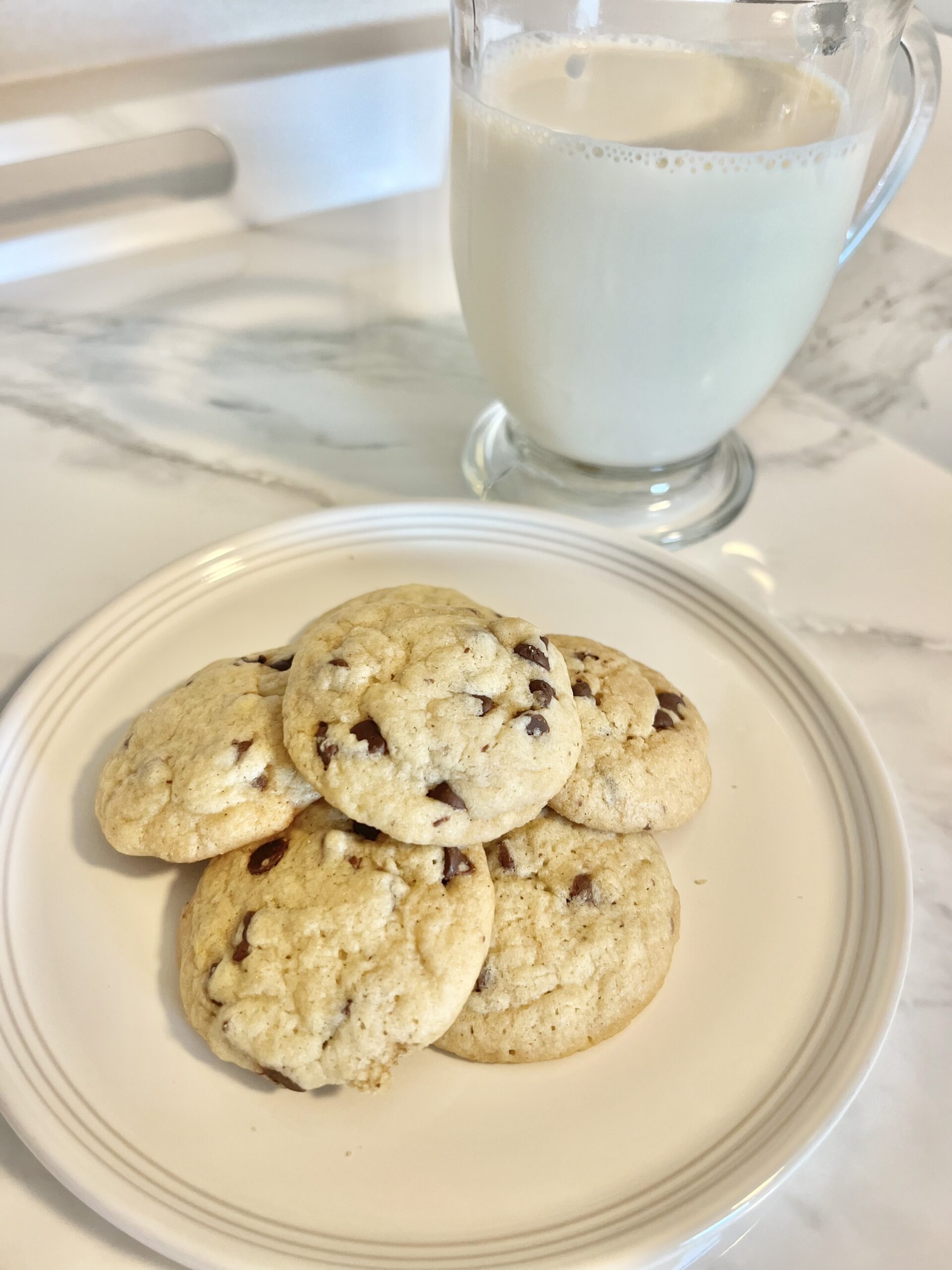 Lastly, fold in the chocolate chips and roll into 1 heaping tsp ball. Bake the cookies in the upper middle and lower middle rack for 10 minutes. They should puff up and the tops no longer wet.
